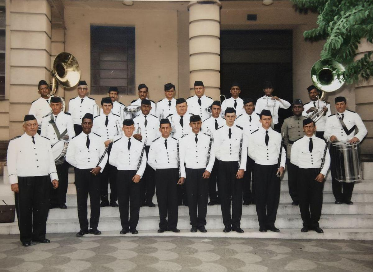 Nossa Banda Municipal. fileira da frente: maestro Guido Bellon, João Daniel de Souza, Ademar Silveira, José Brandão de Lima, Angelo Estevan Volpato (Pasta), Mario Bellon, Armando Schiavon e Luiz Lovato.