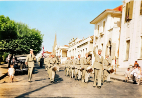 A fanfarra do Instituto Americano de Lins desfila na rua Olavo Bilac, ao lado da Praça Coronel Piza, esquina com a 21 de Abril.
